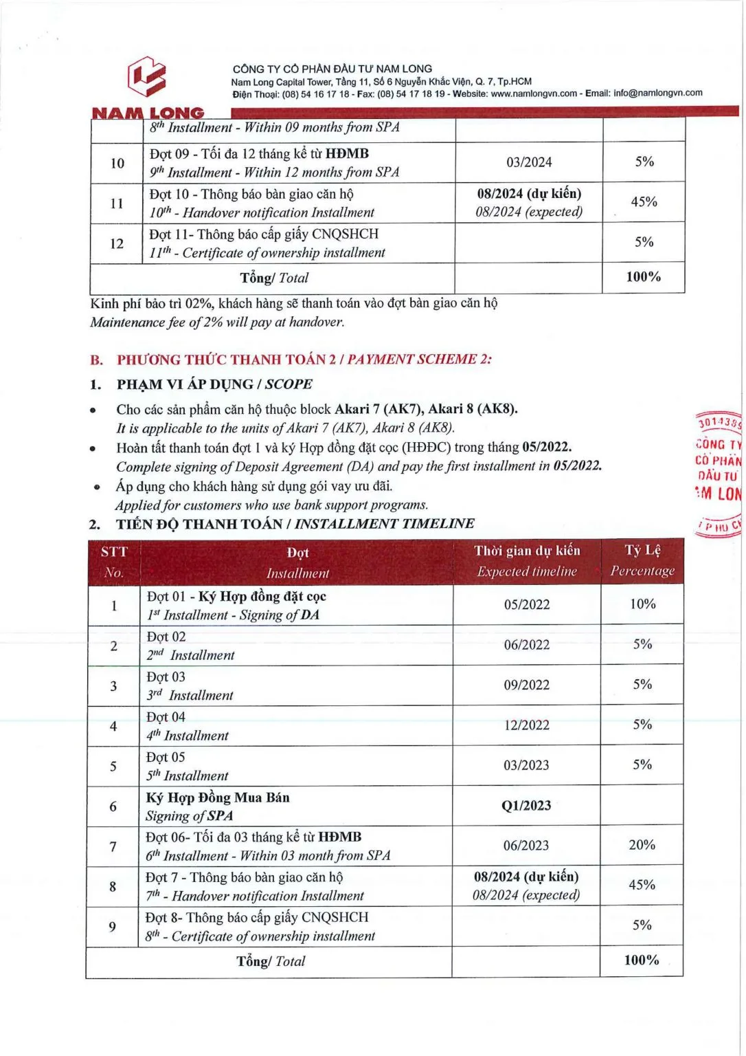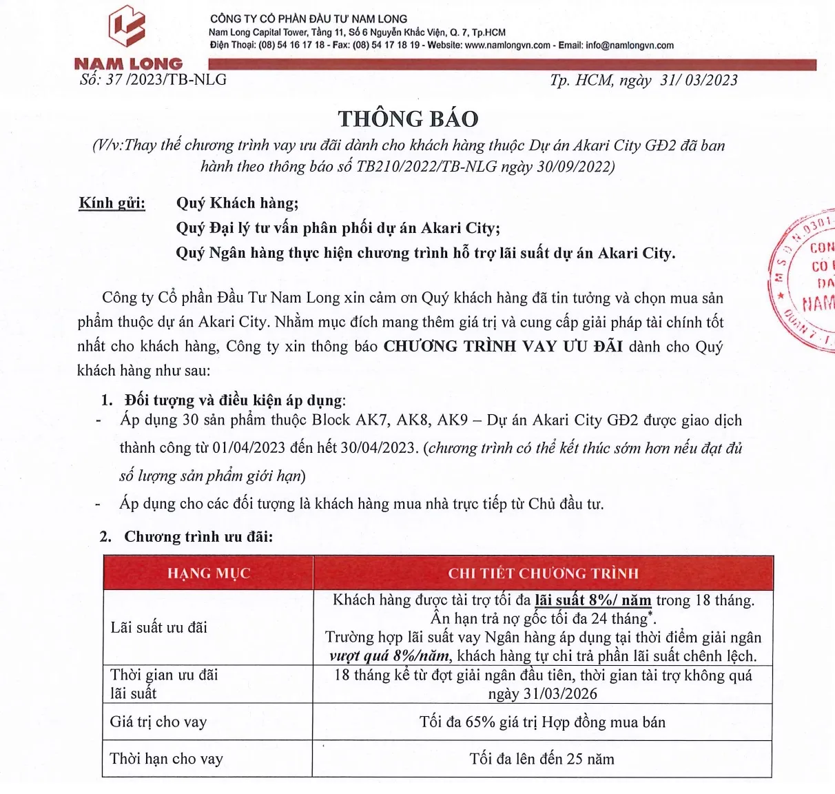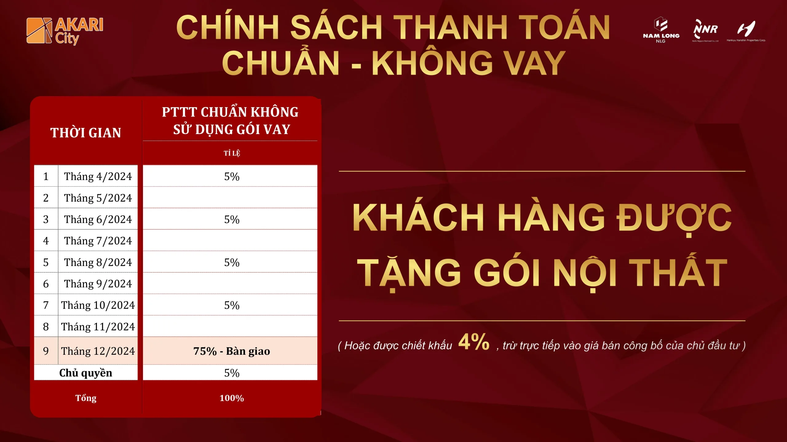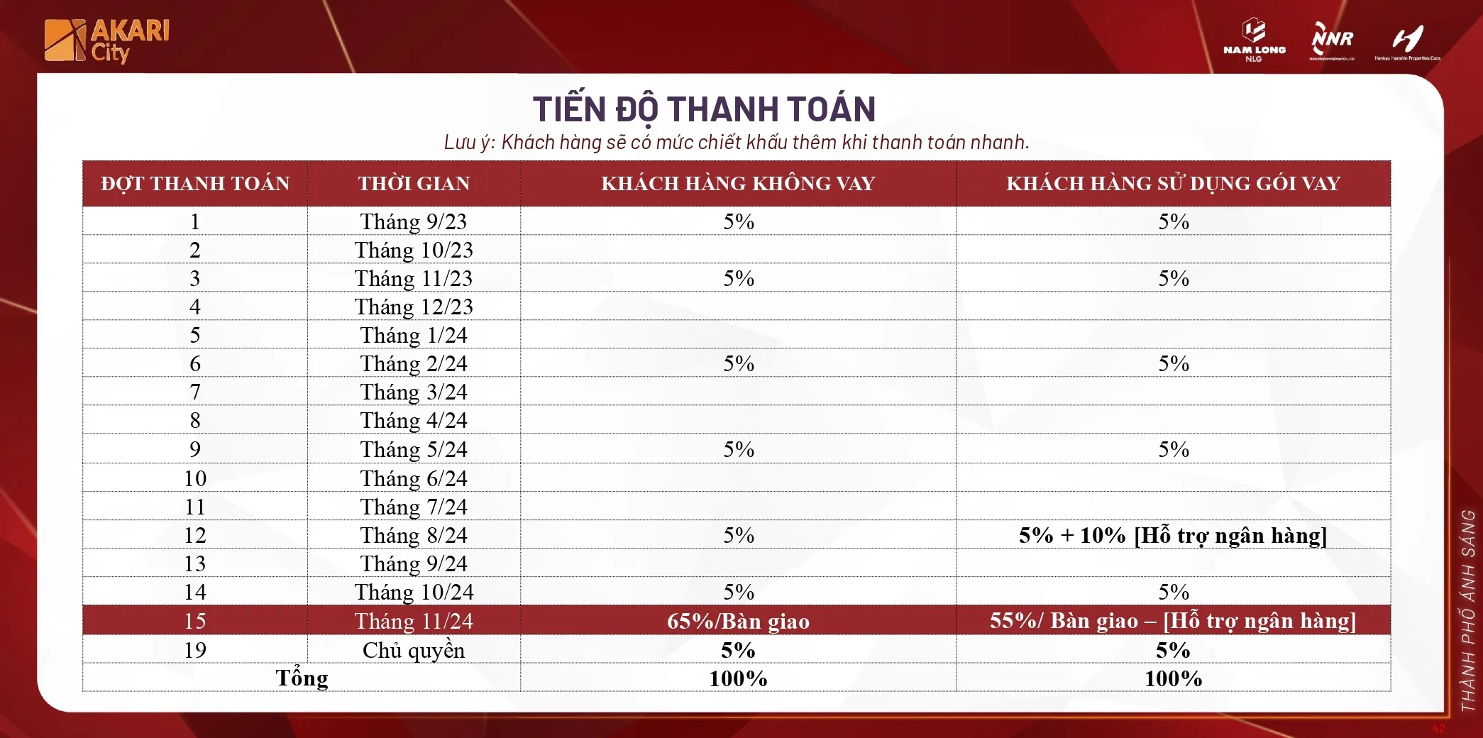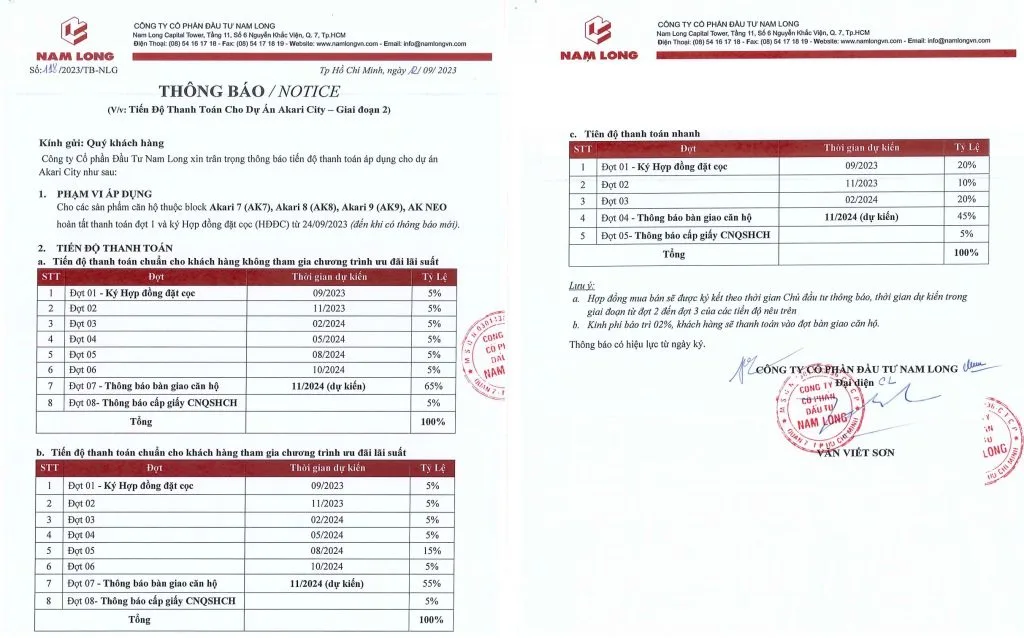 Chủ đầu tư (CĐT) cam kết khách hàng mua sản phẩm Bất động sản (BĐS) Akari City do Nam Long phân phối sẽ mua đúng giá do CĐT công bố ở từng thời điểm bán hàng theo chính sách được công bố tại thời điểm khách hàng ký Hợp Đồng Mua Bán.